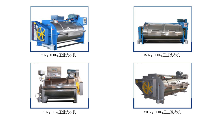 工业洗衣机:按容量大小分为:15kg、30kg、50kg、70kg、100kg、150kg、200kg等系列。该设备是滚筒型,内、外壳采用优质不锈钢制作而成,平整光滑、耐腐蚀、不损伤织物。该机由内筒、外筒、电机、支撑总成、传动总成、电器总成组成。结构合理、安装使用方便。工作原理:由顶置电机、三角胶带、带动传动总成,使内筒作正反转运转,通过织物与织物、织物与内筒壁的相互摩擦,达到洗涤效果。机器内置过热、过载装置、定时装置、正反转控制装置。外筒门设有安全装置,若运行中门被打开,机器立即停止运转,确保机器、操作人员的安全。